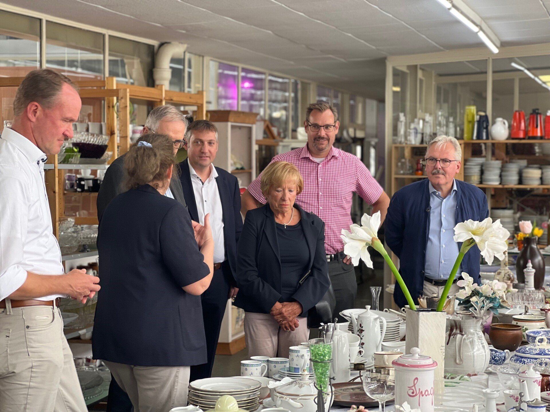 Eine Delegation unserer CDU-Kreistagsfraktion hat das Kaufhaus „Tisch und Teller“ in Flörsheim besucht. Hierbei handelt es sich um ein gemeinnütziges Projekt des regionalen Diakonischen Werkes Main-Taunus in Zusammenarbeit mit dem Main-Taunus-Kreis. Das nachhaltige und soziale Kaufhaus bietet eine große Auswahl an gebrauchten Dingen zu kleinen Preisen – von der Kaffeetasse bis zum Kleiderschrank, sogar Fahrräder können gekauft, aber auch in der hauseigenen Fahrradwerkstatt repariert werden. Da alle angebotenen Waren aus Spenden bestehen, freut sich das Team immer über gut erhaltene Sachspenden.